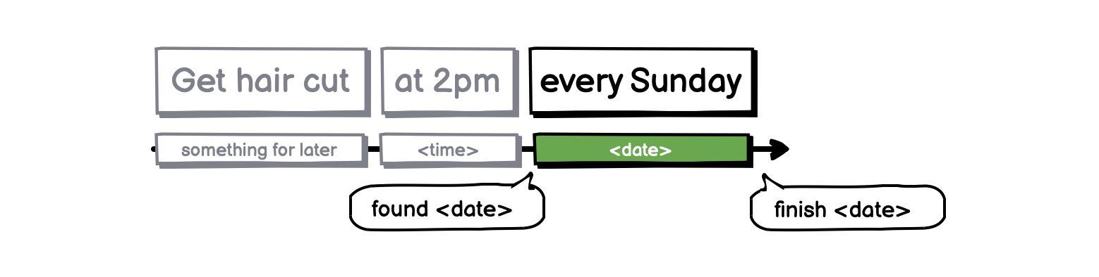 Sau khi xác định xong <time> token, đi tiếp và nếu gặp "on" hoặc "every", ta sẽ bắt đầu parse <date> token.