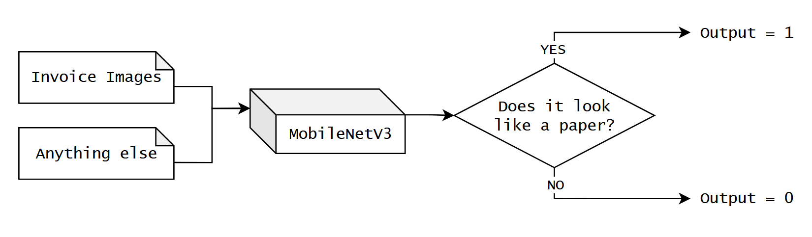 Cũng giống như model vision-based transformer ở trên, phiên bản pre-trained của MobileNetV3 cũng support phân loại khoảng 1000 labels khác nhau. Đối với feature mà chúng ta đang xây dựng, thì model chỉ cần nhận diện một hình ảnh có dạng của một chiếc invoice hoặc là không, tức là chỉ cần 2 label: valid và invalid.