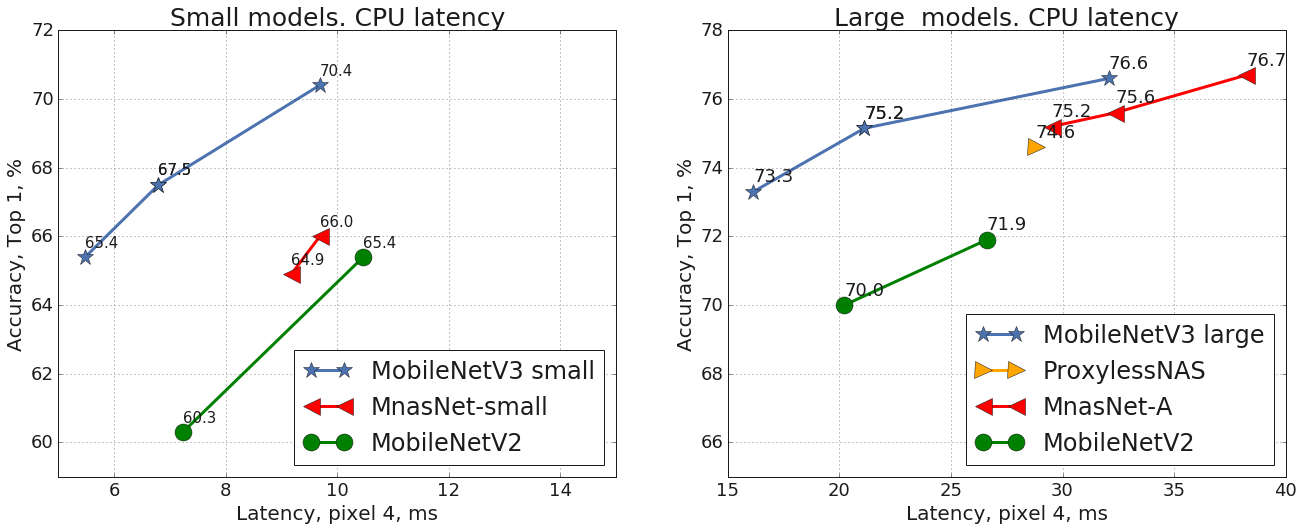 MobileNetV3 có 2 phiên bản, Large và Small, khác biệt nhau về độ chính xác (accuracy) và tốc độ xử lý (latency), như sơ đồ trên. Ở đây, vì yêu cầu về tốc độ nên mình chọn sử dụng MobileNetV3 Small.