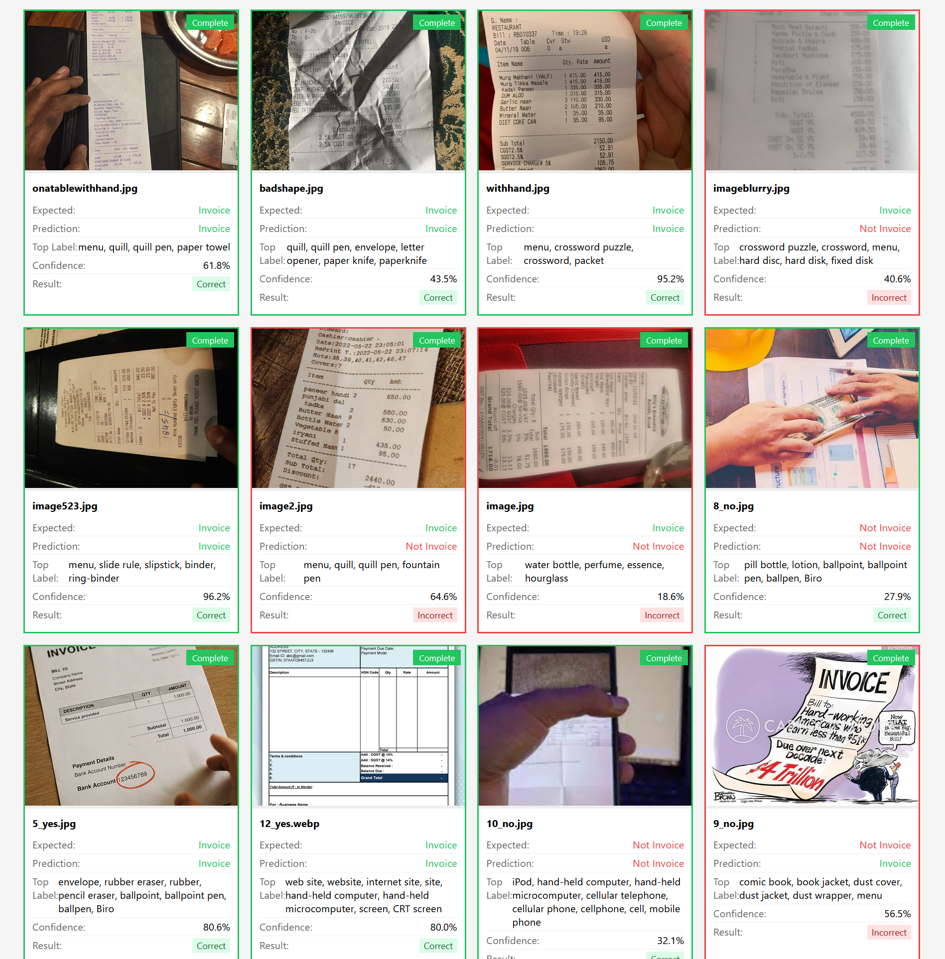 So với model có sẵn ở phần trước, chúng ta có thể thấy model nhận diện tốt hơn, những ví dụ mà ở phần trước bị nhận nhầm là invoice như hình chụp màn hình chiếc điện thoại, hoặc mẫu truyện tranh đã được model mới xác định là không phải invoice.