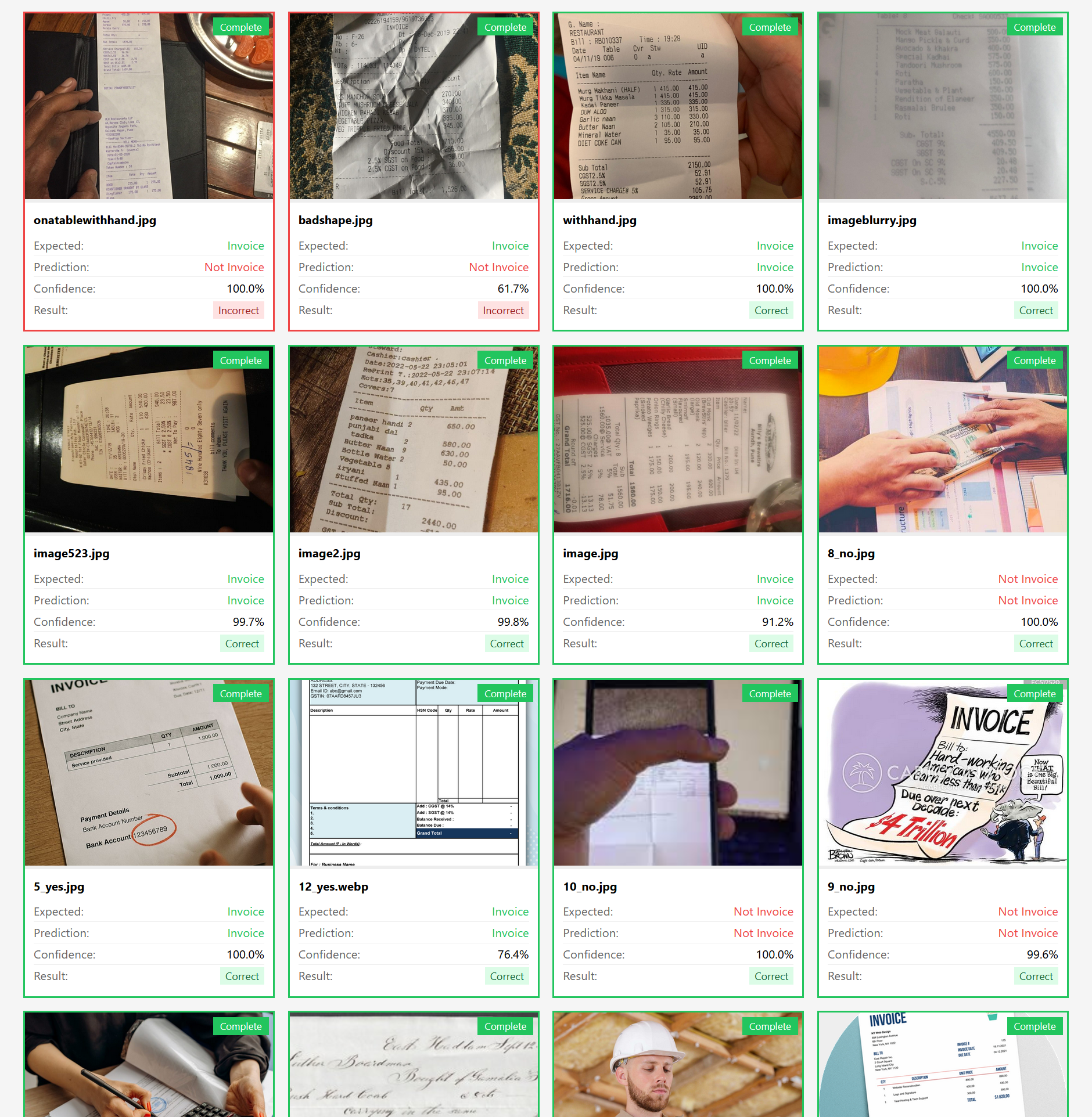 Có một vài trường hợp model mới nhận diện sai, ví dụ 2 tấm hình đầu trong screenshot, một hình có tờ invoice quá dài, một hình có tờ invoice bị nhàu nát, lý do là vì trong tập dữ liệu input chúng ta không có 2 trường hợp này. Và để cải thiện, chúng ta chỉ cần bổ sung thêm vài chục hình example cho mỗi trường hợp (nghe vẫn đáng tin cậy hơn là ngồi thêm/bớt label, đúng không?).