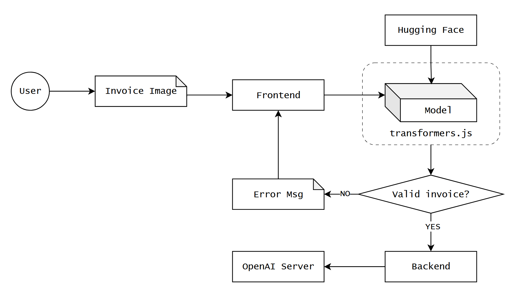 Khi chạy, transformers.js sẽ tự động download model về trình duyệt của user, bước này chỉ xảy ra 1 lần, và ở các lần visit về sau, model sẽ được cache lại. Khi user cần upload một hình ảnh, chúng ta sẽ phân loại hình ảnh này ngay trên trình duyệt, và chỉ gửi lên backend nếu hình ảnh trên là invoice/receipt hợp lệ, ngược lại, chúng ta sẽ đưa ra một thông báo lỗi, và yêu cầu user kiểm tra lại hình ảnh đã chọn.